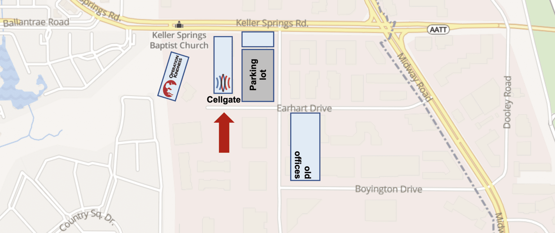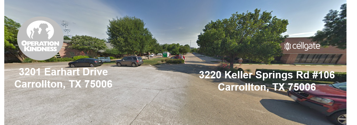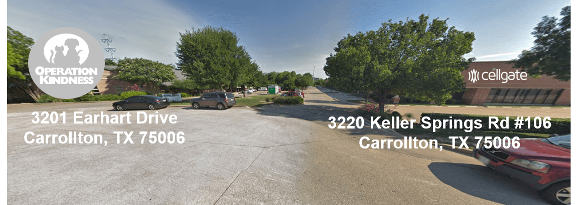 For simplicity, program your GPS for 3201 Earhart Drive, and you will arrive to the end of the cul de sac on Earhart Drive and see our building/sign directly across the street from Operation Kindness.